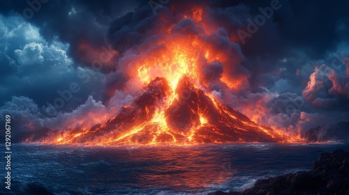 Explosive Volcano Eruption on a Volcanic Island Lighting Up the Sea. Generative AI