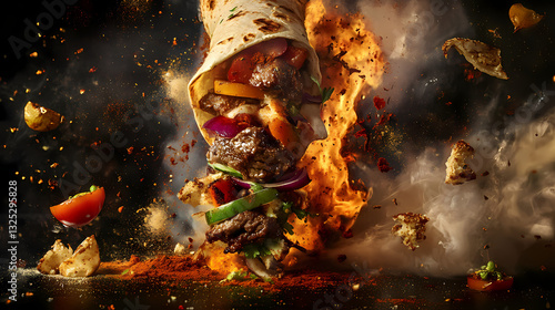 Explosive Wrap: A dynamic and appetizing composition of a wrap in mid-air, showcasing an explosion of fresh ingredients and tantalizing flavors.