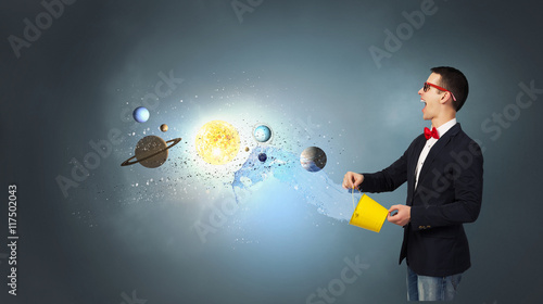 bucket, man, business, businessman, male, career, caucasian, idea, space, planet, sun, system, creativity, colours, create, art, creative, brainstorming, individuality, concept, occupation, cheerful, employment, yellow, contemporary, mature