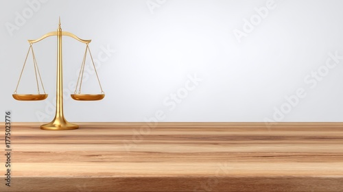 Exquisite golden balance scale resting on rustic wooden tabletop symbolizing justice and precise measurement accuracy.