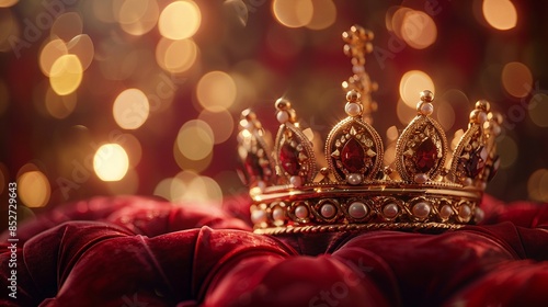 Exquisite golden crown placed on a red velvet pillow, detailed and ornate, illuminated by warm bokeh lights, royal and opulent, luxurious scene 8K , high-resolution, ultra HD,up32K HD