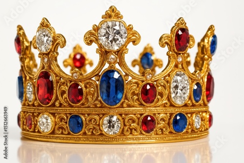Exquisite golden royal crown encrusted with dazzling diamonds rubies and sapphires presented on a pure white reflective surface for luxury and royalty concepts.