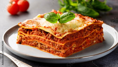 Exquisitely styled lasagna piece showcasing golden melted cheese, rich meat sauce, layered pasta sheets, and fresh basil leaves. Perfect representation of Italian cuisine served with charm.