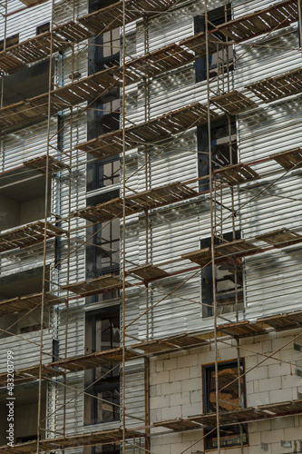 Extensive scaffolding providing platforms for work in progress on a new apartment block,Tall building under construction with scaffolds,Construction Site of New Building