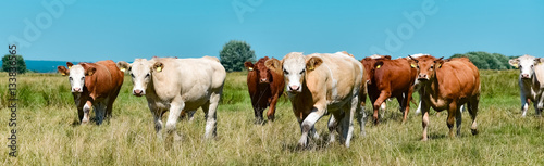 brown, cow, cow, flock, several, outside, meadow, meadow, outdoors, attitude, run, game, steppe, blue skies, banner, widescreen, farm, farming