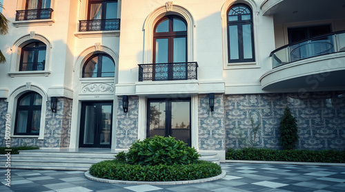 Exterior View of a Cream-Colored Building with Arch Windows and Landscaping