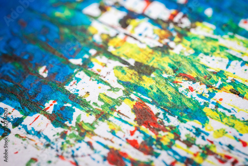 Extreme close up of colorful acrylic paint texture showing brush strokes. Selective focus.