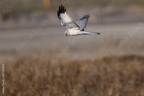 Extremely close view of a male hen harrier (Northern harrier) flying in beautiful light, seen in the wild in North California