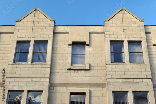 building, facades, apartment, residential, concrete, modern, block, window, sky, roofline, blue, bare, plain, modernist, flats, home, front, britain, scotland, sunny, architecture, design
