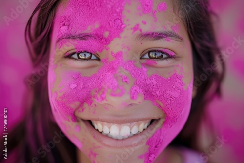 Face of a girl with powder and colorful paint in pink flower, Holi hai day concept.