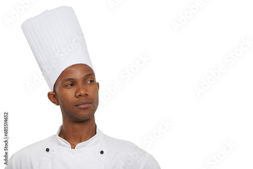 Face of chef with pride, confidence and professional isolated on transparent png background. Fine dining, hospitality or catering with black man, cook or baker with excellence in restaurant career.
