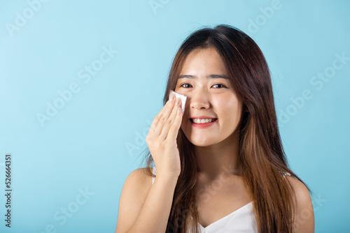 Facial Beauty Treatment Hygiene skin. Asian beautiful young woman removing cosmetic make up using pad cotton face cleaner disc, studio shot isolated on blue background, Happy female cleaning eyes