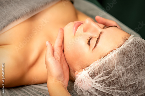 Facial massage. Hands of a masseur massaging neck of a young caucasian woman in a spa salon, the concept of health massage