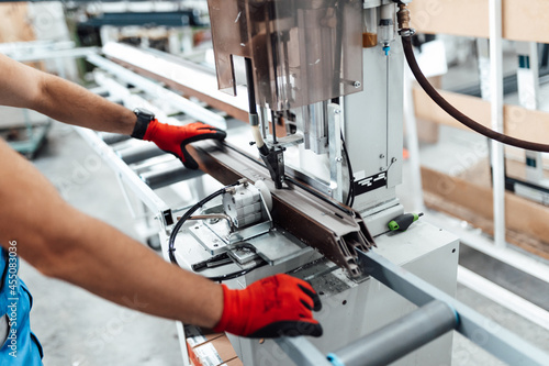 Factory for aluminum and PVC windows and doors production. Manual worker assembling PVC windows and doors.