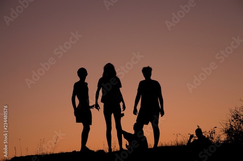 sunset, shape, people, couple, love, sun, family, heaven, friendship, nature, sunrise, woman, young, summer, afoot, happy, countryside, running, orange, person, walk, hiking, romance, evening, fellow
