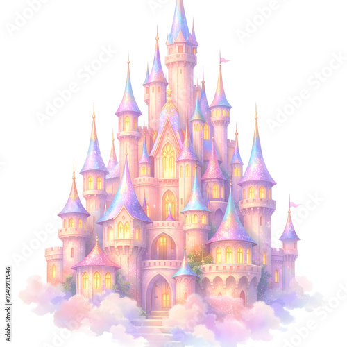 Fairy tale castle on a hill with towers and domes in a fantasy medieval style