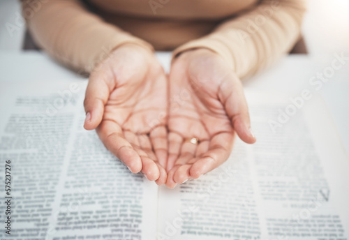 Faith, prayer and bible with hands of woman for religion, support and Christian worship. Believe, spirituality and God with girl praying over catholic holy text for wellness, respect and hope