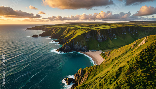 Falaises verdoyantes au bord de l'océan au coucher du soleil