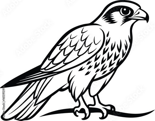 Falcon on branch, bird silhouette line art, perched raptor drawing, wildlife vector illustration, minimal nature scene