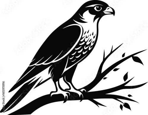 Falcon on branch, bird silhouette line art, perched raptor drawing, wildlife vector illustration, minimal nature scene