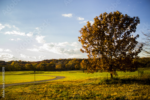 autumn, tree, landscape, nature, fall, sky, forest, grass, field, yellow, green, tree, blue, park, countryside, season, rural, meadow, colours, scenery, oak, leaf, leaf, foliage