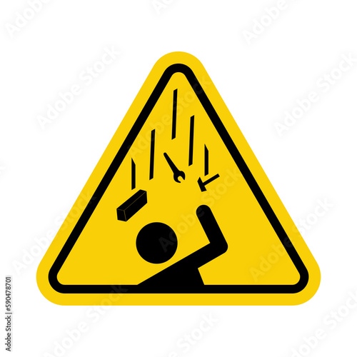 Falling objects danger sign. Falling objects warning sign. Caution, falling objects from a height on construction sites cause injury. Yellow triangle sign with icon of falling tools on a person.