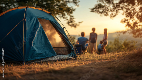 camping, family, tent, sunset, nature, leisure, togetherness, adventure, relaxation, summer, children, horizon, silhouette, recreation, lifestyle, travel, bonding, sitting, vacation, joy, exploration, landscape, calmness, greenery, evening, soft light