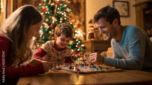 Family enjoying a joyful board game night by the Christmas tree during holiday season