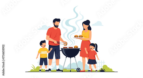 Family Enjoying A Sunny Afternoon Grilling Burgers In Their Backyard Garden Scenario