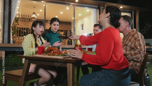 Family gather celebrate holiday. Parents, grandparents and girl together to talk and have dinner party food. Outdoor activity for spending time with multigeneration cross generation gap. Divergence.