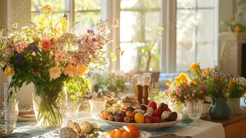 Family gathering for Easter brunch, with spring flowers and festive table decorations.