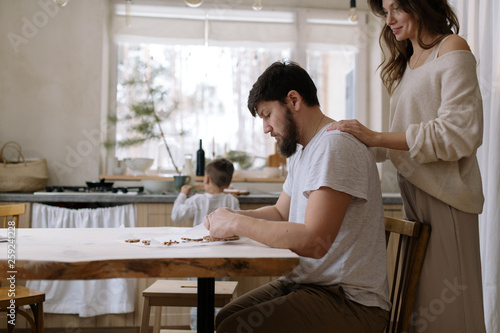horizontal, home, help, happy, happiness, funny, family, dough, cute, cosy, cooking, cookie, comfortable, childhood, young, children, tasty, cheerful, table, boy, sweet, adorable, small, kindergartner, positive, playing, pastry, parenthood, eltern, little, lifestyle, leisure, massaging, kitchen, innocent, indoor, house, caucasian, white, woman, female, lady, person, people, adult, adult, 30s, grown-up, male, children, toddler, toddler, children, children, offspring, tyke, tot, children, man