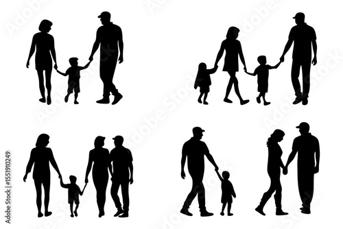 Family silhouettes on the go: a series of silhouettes depicting a diverse family's shared moments, walking hand in hand. Each silhouette captures the essence of familial bond.