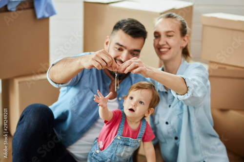 Family sit on floor near open box. Man and woman hold keys. Camera focus keys. Background moving boxes