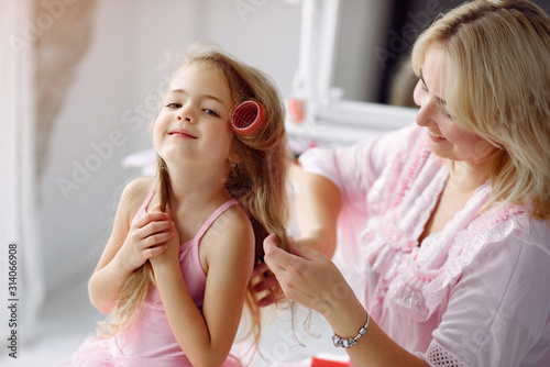 childhood, beauty, mother, daughter, beautiful, fun, female, children, family, people, fashion, girl, hair, mother, curler, joy, woman, cute, together, face, caucasian, cosmetic, little, children, make-up, day, playing, eltern, care, adorable, mother, home, portrait, glamour, style, small, concept, bedchamber, room, motherhood, fashionable, morning, background, pajama, play, party, artificial, showing