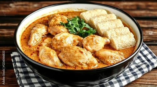 Famous Food of Indonesia concept. Delicious chicken curry served with rice cakes and garnished with fresh herbs.