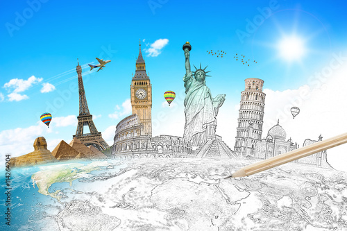 landmark, historical building, travel, vacation, holiday, journey, trip, famous, place, earth, globe, international, hand, drawn, hand-drawn, art, artistic, draw, drawing, picture, painting, outline, vignetting, design, artwork, graphic, illustration, pen, crayons, earth, flight, concept, planet, continent, tour tourism, holiday maker, weekend, adventure, destination, escapade, freedom, excursion, transportation, summer, visit, country, traveler, tour, agency