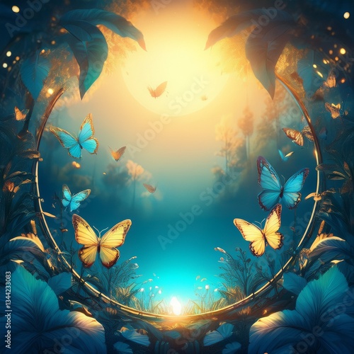 fancy and magical butterfly border frame with beautiful sun and glowing background; Graphic resource