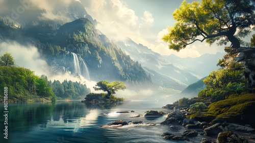 Fantasy Mountain Landscape with Waterfall