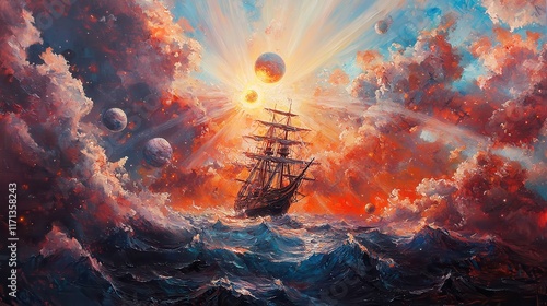Fantasy seascape with a ship under a vibrant sunset, sunbeams illuminating the waves, celestial planets above, created with oil on canvas and rich watercolor hues.