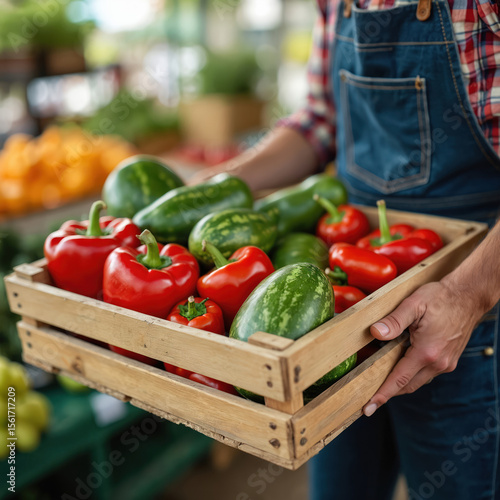 Farmer carries wooden crate filled with fresh organic fruits vegetables at farmers market. Red bell peppers watermelons cucumbers. Healthy food local produce. Supporting local farms. Autumn harvest