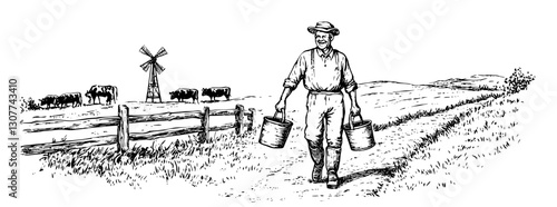 vector, farmer, bucket, path, windmill, cattle, grass, countryside, agriculture, rural, landscape, nature, farm animal, serene, traditional, walking, horizon, summer, harmony, peaceful, community, hard work, bounty, growth, vintage, craftsmanship, scenery, farming, simplicity, pastoral, engagement, tribute, heritage, industrious, nostalgic, quaint, village