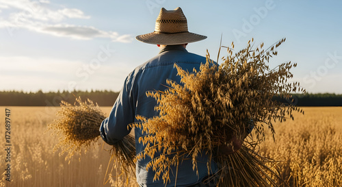 wheat, field, farmer, sunset, harvest, nature, agriculture, rural, landscape, crop, gold, traditional, grain, scenic, sunshine, textured, outdoors, people, silhouette, background, sky, season, country, land, natural, growth, farming, time, peaceful, tranquil, back, view, straw, hat, stalk, sunny, day, horizon, farmland, cereal, production, environment, sustainability, agronomy, man, hours, life, closeup, organic