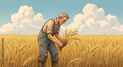 farmer, harvesting, wheat, gathering, standing, illustration, agricultural, rural, sunny, field, sky, cloud, farming, crop, harvest, plant, grain, growth, countryside, overall, plaid, shirt, grey hair, day, artwork, cartoon, vintage, nostalgia, country, healthy, lifestyle, tradition, occupation, fresh, natural, food, economy, agriculture