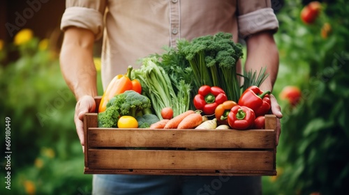 farmer holding wooden box full of fresh vegetables. harvesting season. basket with vegetables in the hands of a farmer background, healthy, organic, food, agriculture