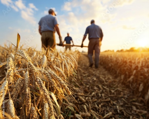 harvesting, farmer, scenic, wheat, warm, effort, oneness, labor, collaboration, teamwork, twilight, sunshine, community, vibrant, land, grain, produce, earth, farming, harvest, together, growth, tool, scenery, productivity, dirtied, people, crop, planting, work, crop, gold, rural, industry, evening, sky, nature, season, environment, farm, summer, landscape, organic, agriculture