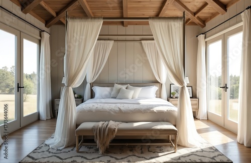 Farmhouse bedroom features canopy bed with sheer curtains. Natural light streams in through large glass doors revealing outdoor landscape. Neutral colors, wood accents create cozy, inviting