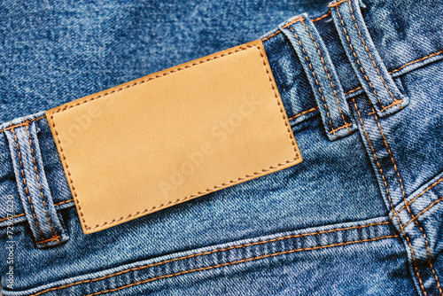 Fashion background with empty copy space for graphic design. Blank leather label tag. Blue jeans denim texture with thread sew lines. Brown clothing tag.