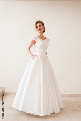dress, bride, wedding, beauty, woman, fashion, beautiful, white, young, gown, bridal, elegance, model, portrait, princess, hair, studio, person, happy, isolated, people, marriage, cute, glamour, 1, adult, style, face, girl, female, posing, caucasian, make-up, love, coiffure