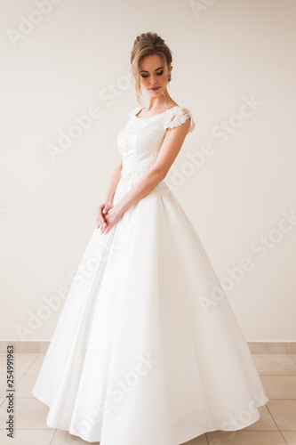Fashion bride in gorgeous wedding dress studio portrait. Beautiful model with bridal makeup and hairstyle in marriage lace dress.